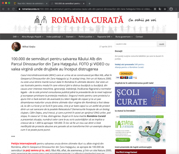 " Cazul microhidrocentralei (MHC) care ar urma să se construiască pe Râul Alb, aflat în Geoparcul Dinozaurilor din Țara Hațegului și, în același timp, într-un sit Natura 2000, nu este unul dintre marile tunuri date în România în ultimele decenii. Dar este un caz ilustrativ pentru modul în care viitorul țării e distrus bucățică cu bucățică, din cauza unor interese meschine, ignoranță, indolență, încălcarea flagrantă a normelor legale – de la cele privind consultarea publică până la prevederile de la nivel național și european privitoare la protecția mediului. Singurul motiv pentru care proiectul a ajuns într-o fază extrem de avansată (cu tăieri ilegale de copaci și la un pas dinamitarea malurilor unuia dintre ultimele râuri virgine din România) a fost ideea că, la cât s-a furat și se fură în țara asta, cine și-ar bate capul cu un astfel de proiect dintr-un sat oarecare de la poalele Retezatului? Demersurile începute de un biolog clujean, Călin Dejeu, anul trecut, și care a primit în acest an sprijinul ONG-urilor, pot stopa, în ceasul al 12-lea, distrugerea. După ce în luna martie România Curată a prezentat situația, numărul celor care le-au scris autorităților să se implice a crescut de la 1.400 la aproape 100.000. În loc să fie un nou caz dintr-o listă nesfârșită de proiecte abuzive are șansele să se transforme într-un exemplu despre cum li se poate pune punct.