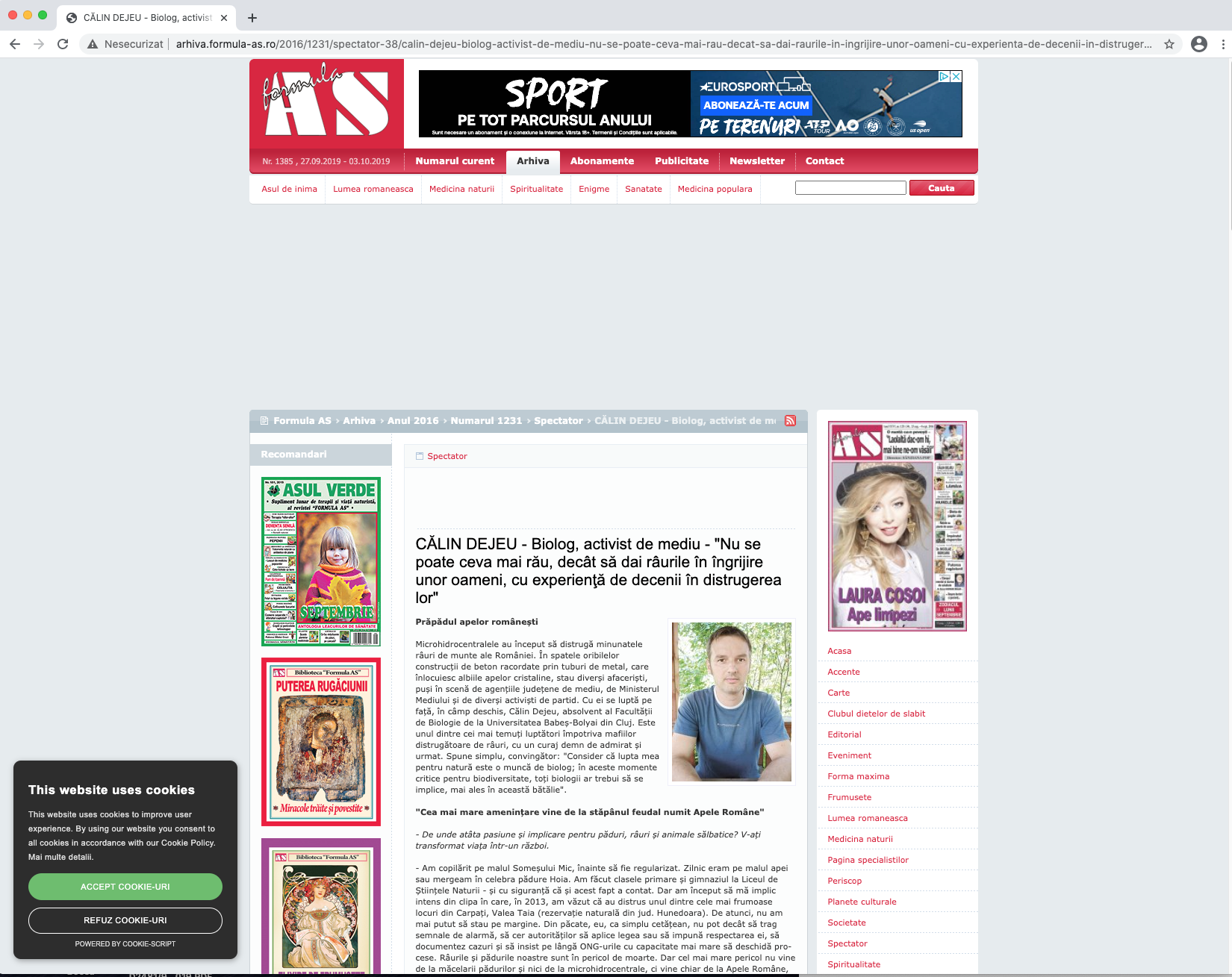 - Am copilărit pe malul Someşului Mic, înainte să fie regularizat. Zilnic eram pe malul apei sau mergeam în celebra pădure Hoia. Am făcut clasele primare şi gimnaziul la Liceul de Ştiinţele Naturii - şi cu siguranţă că şi acest fapt a contat. Dar am început să mă implic intens din clipa în care, în 2013, am văzut că au distrus unul dintre cele mai frumoase locuri din Carpaţi, Valea Taia (rezervaţie naturală din jud. Hunedoara). De atunci, nu am mai putut să stau pe margine. Din păcate, eu, ca simplu cetăţean, nu pot decât să trag semnale de alarmă, să cer autorităţilor să aplice legea sau să impună respectarea ei, să documentez cazuri şi să insist pe lângă ONG-urile cu capacitate mai mare să deschidă procese. Râurile şi pădurile noastre sunt în pericol de moarte. Dar cel mai mare pericol nu vine de la măcelarii pădurilor şi nici de la microhidrocentrale, ci vine chiar de la Apele Române, stăpânul feudal peste râuri, care vrea să transforme apele vii în canale, prin regularizări opuse conceptelor contemporane de management al apelor. Apele Române asigură unor firme pretextul perfect pentru obţinerea banului public. Au întocmit planuri pe bazine, numite eufemistic "planuri pentru prevenirea, protecţia şi diminuarea efectelor inundaţiilor", care prevăd exterminarea reţelei hidrografice. Mi-am "permis" să contest un asemenea plan şi am primit de la "firma de curte" a Apelor Române, care l-a întocmit, Aquaproiect S.A., un răspuns fioros: amestec de ameninţări, jigniri, recunoaşterea ilegalităţii propriului plan şi etalarea dispreţului faţă de legislaţia comunitară. Din păcate, aceste planuri au primit undă verde de la Agenţia Naţională pentru Protecţia Mediului - strict ilegal, fără aviz de mediu.