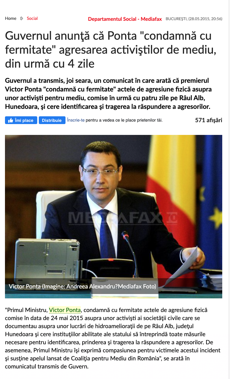 Primul ministru, Victor Ponta, condamnă cu fermitate actele de agresiune fizică comise în data de 24 mai 2015 asupra unor activişti ai societăţii civile care se documentau asupra unor lucrări de hidroamelioraţii de pe Râul Alb, judeţul Hunedoara şi cere instituţiilor abilitate ale statului să întreprindă toate măsurile necesare pentru identificarea, prinderea şi tragerea la răspundere a agresorilor. De asemenea, Primul Ministru îşi exprimă compasiunea pentru victimele acestui incident şi susţine apelul lansat de Coaliţia pentru Mediu din România", se arată în comunicatul transmis de Guvern.Comunicatul a fost transmis după ce Coaliţia pentru Mediu din România le-a solicitat preşedintelui Klaus Iohannis şi premierului Victor Ponta să ia măsuri urgente pentru a garanta securitatea activiştilor de mediu, după cazul de agresiune asupra acestora de la Hunedoara.