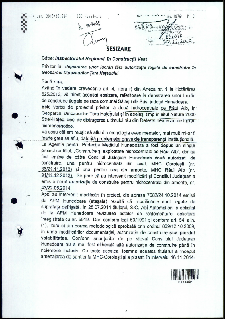 Sesizare Inspectoratul Ragional Dejeu Nicolae Calin